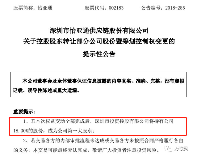 2018年9月10日,怡亚通发布关于控股股东转让部分公司股份暨筹划控制权变更的提示性公告。公告显示,本次股权出让完成后,深圳投控将持有公司388453701股股份(占公司股份总数的18.3%),成为公司的第一大股东,公司也将成为深圳投控的控股子公司。