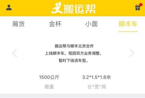 最近顺丰联手搬运帮app推出同城货运服务消息不胫而走,但过程一波三折。9月26日下午,搬运帮app下线“顺丰车”。9月27日,搬运帮app车型中又出现“顺丰车”,但车型显示页面为一则公告——“搬运帮与顺丰北京合作上线顺丰车,现因双方业务调整,暂时下线该车型”。