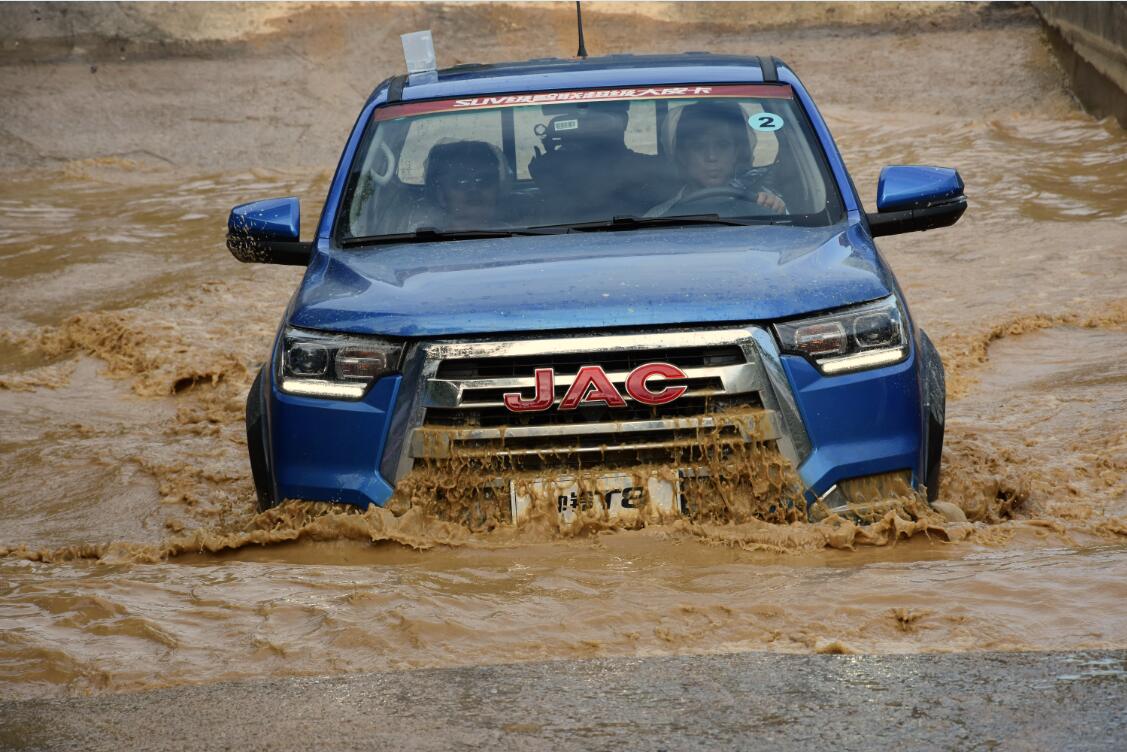 驾控体验活动的最后一个环节是涉水路段,帅铃T8皮卡最大离地间隙为220mm,最大涉水高度为1070mm,其中活动现场水塘的水深超过60cm,而帅铃T8皮卡通过过程中依旧是平稳顺利,当然日常驾车通过涉水路段时,一定要减速,还是建议大家切莫快速冲进涉水路段,以免激起水波回流,水从发动机口进入发动机内,对车辆正常使用造成危害。
