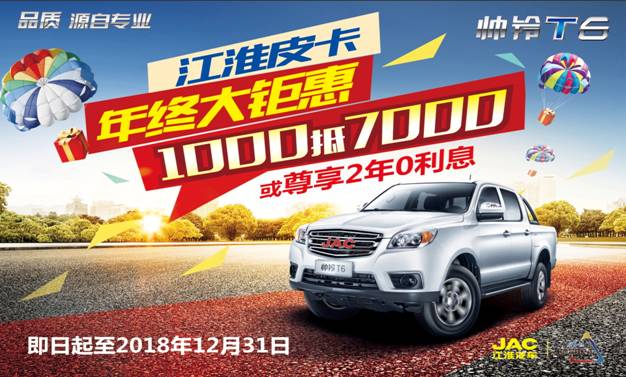 从即日起到12月31日,江淮皮卡年终感恩大回馈,凡购买帅铃T6全系皮卡即享受交1000元抵7000元年终钜惠,妥妥的帮你节省一大笔开支。看到如此令人兴奋的优惠活动,您是否已经按奈不住?江淮皮卡告诉您,选择不止一种,需要购车贷款的用户还能选择3成首付2年零利息的优惠活动,帮您节省近万元开支,购车从此不再是压力。