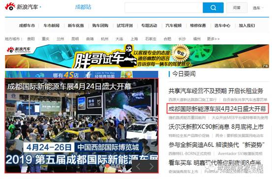 2019年4月24-26日,由振威展览股份主办的第五届成都国际新能源车展将在中国西部国际博览城召开。据成都国际新能源车展组委会相关负责人介绍,腾讯、新浪、网易、太平洋汽车、中国新能源汽车网、四川省电视台、成都市电视台、成都交通台等100多家媒体将会派出专业视频新闻记者团体奔赴展会现场,对本次参展企业的新车发布、技术演讲、产品体验、高峰论坛等活动进行全方位宣传报道。