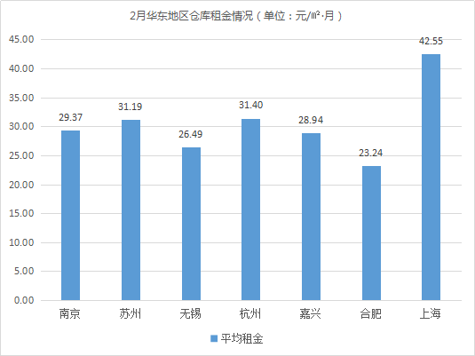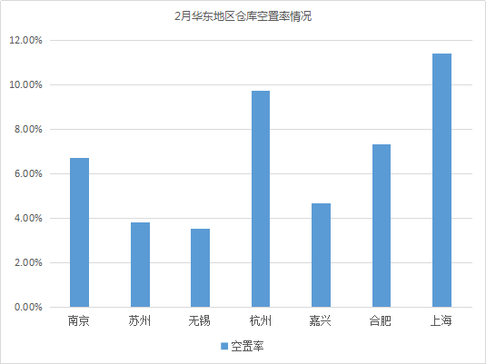 仓库空置率最低的城市为无锡、苏州、嘉兴,空置率均低于5%。相较1月,嘉兴、无锡仓库空置率变化不大;由于苏州仓库租户以物流企业为主,春节期间大部分物流公司停业,仓库需求减少,仓库空置率环比有小幅上涨,涨幅约0.36%。