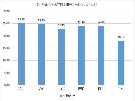 仓库空置率最高的城市为重庆、南昌、昆明,空置率均超26%。相较1月,南昌、昆明仓库空置率波动不大;重庆延续供大于求趋势,仓库空置率有小幅上涨,涨幅约0.60%。