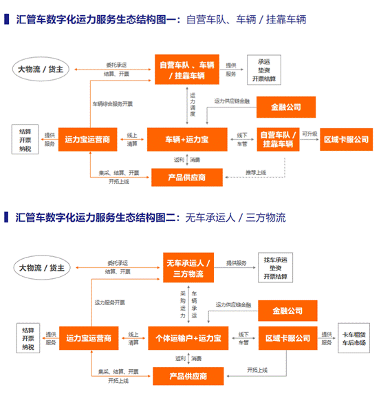 也就是说,在挂靠4.0模式下,无车承运人/物流公司可以通过汇管车的数字化运力供应链服务平台优化成汇管车的运营商和卡车服务公司(简称卡服公司),然后取代了传统的挂靠公司,使得无车承运人/物流公司变成了服务于这些个体车主的主体,为整个的运力市场提供更完整的服务。包括提供车辆租赁、承运、开票结算以及车后市场的集采等。