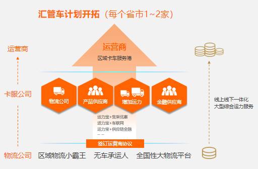 实际上数字化运力供应链的商业模式是通过运营商+卡服公司的运输业务支持为基础的,大型的物流公司和专线车队成为汇管车平台的运营商和卡服公司,卡服公司将现有资源进行整合,发挥规模效应,实现快速扩张。