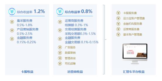 所以,汇管车平台就类似于金融系统的银联组织。我们都知道银行卡是由各家银行提供发放的,但并不了解其背后其实是银联机构在负责清算,而我们看不见的银联,就是各金融机构清算平台的提供方。汇管车平台主要以收取运营商、卡服公司、金融机构、个体车主的平台服务费作为盈利点。
