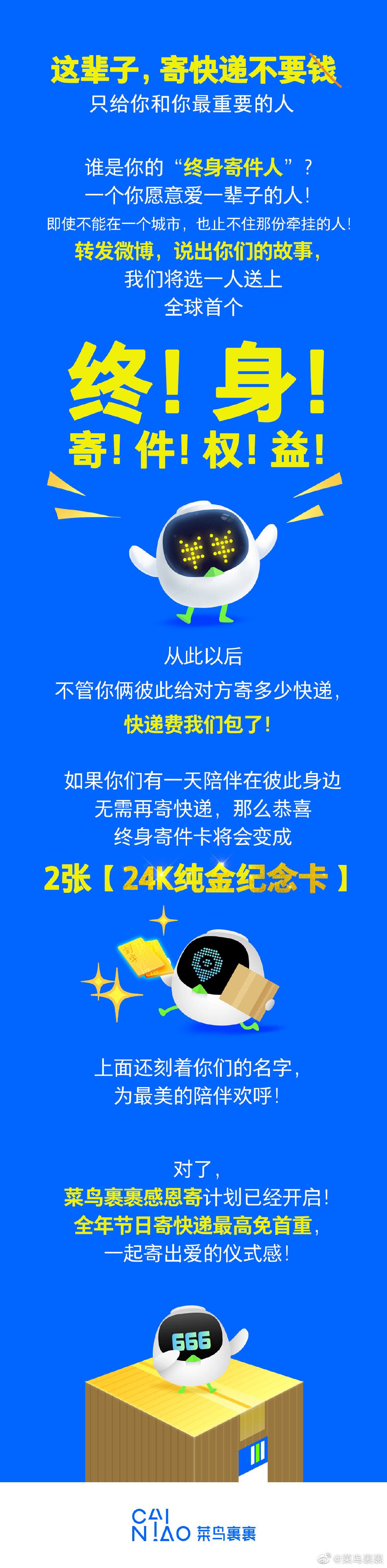 同时推出的寻找“终身寄件人”,在菜鸟裹裹微博表白将有望成为终身寄件人,获选者可选择一位收件人,彼此寄快递终身不用钱。而当两人不再需要彼此寄件时,将得到“感恩寄”纯金纪念卡。