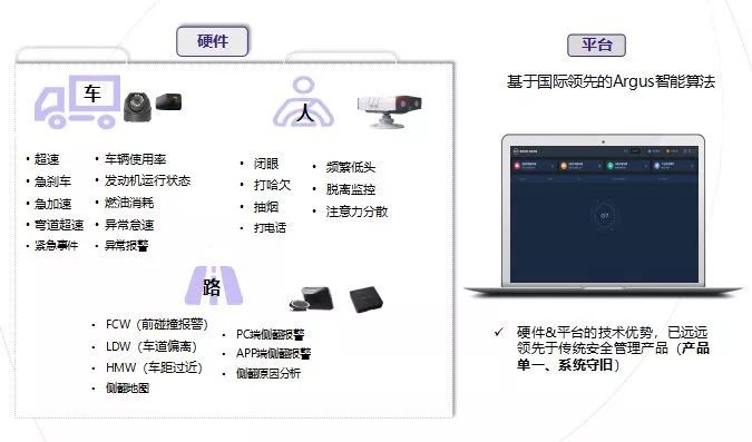 遇到车距过近、车道偏离、前碰撞报警等行为,驾驶预警主动安全辅助系统,基于智能视频分析,主动预警危险事件、及时进行风险预警(提前2.5秒),碰撞事故可降低。