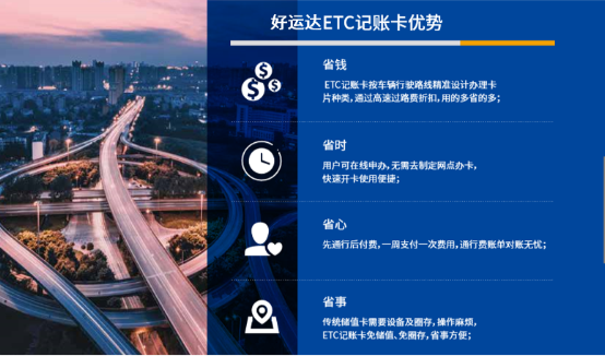 传统储值卡需要设备及圈存,操作麻烦。ETC记账卡免储值、免圈存,省事方便。先通行,后付费,缓解用户资金压力,保障资金安全。通过高速过路费折扣,保证用户用的多省的多。用户可以方便的从储值卡向记账卡过渡。另外,在财务结算和数据管理方面,ETC记账卡可联网记录车辆的交易数据,后期进行数据分析后实现路径优化,提高运输时效;还能实时查询车辆动态,准确记录通行及履约数据,提升财务管理效率和资金周转率。
