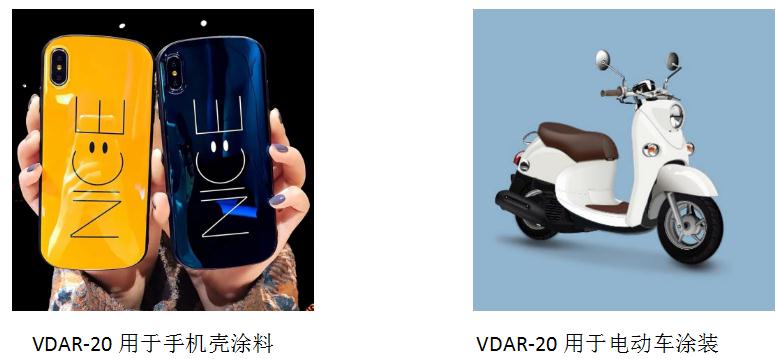 VDAR-20乳液可用于底面合一塑胶涂料,干燥速度快、施工方便,具有良好的耐水性、硬度、耐磨性、耐醇性及优异的附着力,同时具有出色的银粉排列性和耐热水性。适用于ABS、PVC、PC、ABS/PC等基材,水性VDAR-20做底漆加水性聚氨酯面漆配套可用于电子产品、电动车等表面涂装,并得到客户的认可。