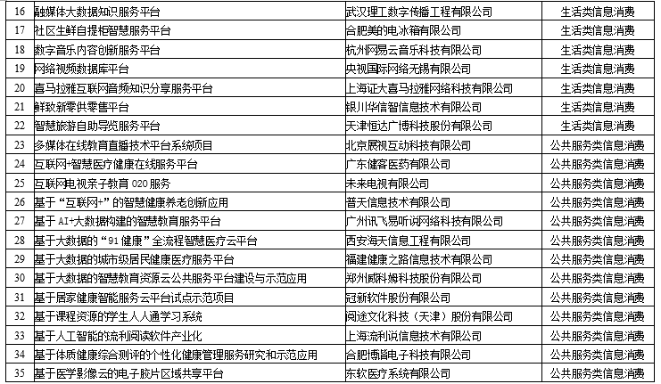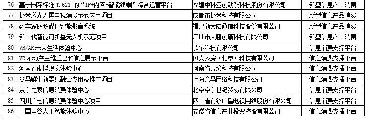 根据《工业和信息化部办公厅关于组织开展2019年新型信息消费示范项目申报工作的通知》(工信厅信软函〔2019〕41号),经地方推荐、专家评审,遴选出86个新型信息消费示范项目,现予以公示。如有异议,请于7月11日前以书面或电话形式反馈工业和信息化部信息化和软件服务业司。