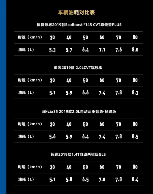 经测试,福特领界百公里油耗为6.7L,由数据可得出,福特领界的燃油经济性要明显强于同级别其他品牌SUV: