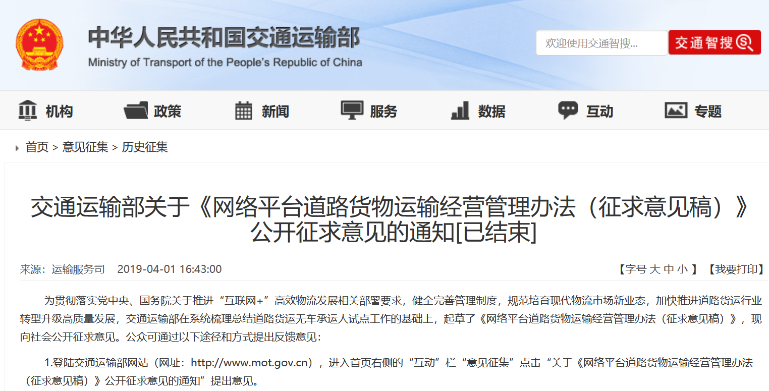 自今年年初以来,《网络货运管理办法》一直在物流行业搞得沸沸扬扬,先是4月1日,国家交通运输部下发关于《网络平台道路货物运输经营管理办法(征求意见稿)》公开征求意见的通知。
