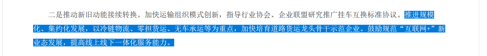 再是5月7日,国务院办公厅转发《关于加快道路货运行业转型升级促进高质量发展的意见》中明确说明会以无车承运为重点,加快培育货运龙头骨干示范企业,鼓励“互联网+”的新业态发展。