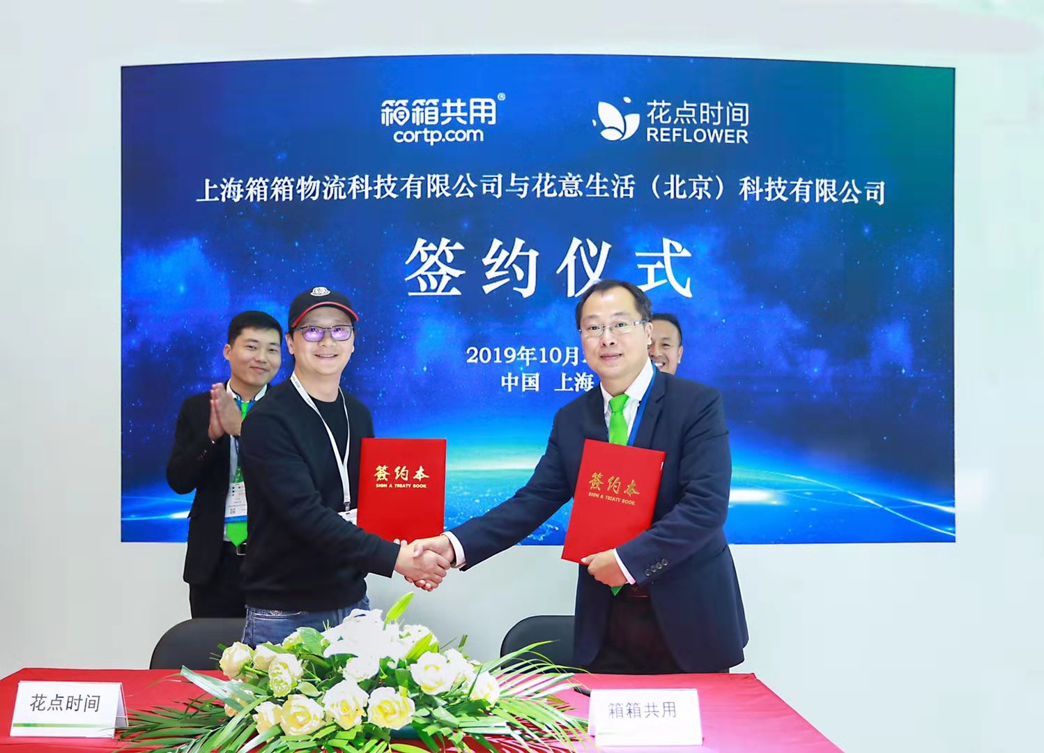花点时间物流副总裁兼华东区总经理衡李泽与箱箱共用集团副总裁王金成现场签约