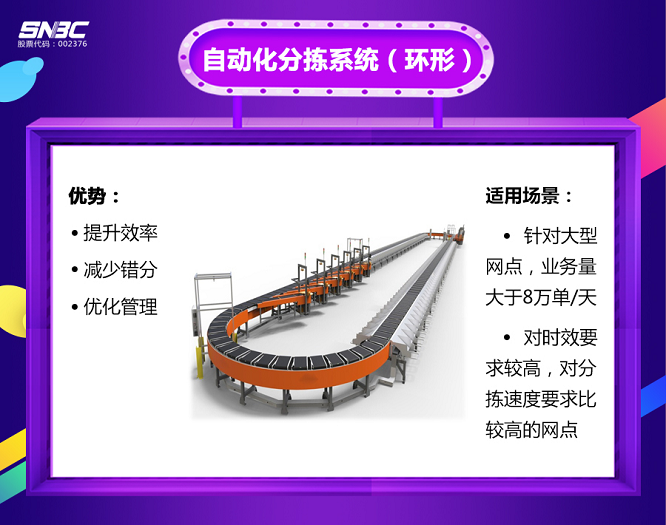 除了自动分拣系统,还有更多智能算法、自动化设备被应用于快递物流大提速的浪潮之中。新北洋依托在光、机、电、软等领域深厚的技术积累和丰富的研发经验,推出不少实用的半自动/自动分拣系列产品及配套设备等物流自动化装备,以自动化分拣系统(环形)产品为例,该设备在分拣速度、分拣准确性和分拣产品种类上相对传统设备都有更高提升。