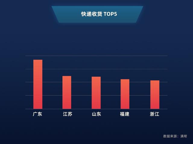 满帮大数据显示,"双十一"当日,快递类货物出港省份TOP5分别为广东、浙江、江苏、上海、河南,这5省贡献了全国60%的发货量。可见,珠三角、长三角仍稳稳地保持着电商优势。