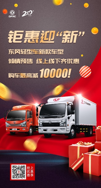 而今年双十一网购狂欢,东风轻型车同步参与。在11月11日0时启动了新款车型预售,线上线下同步促销,购车最高可享受10000元优惠。登录“东风汽车惠享平台”APP即可一键领取无门槛5000元新车购车券;通过惠购平台购买新款车型,可获得微信1000元现金红包。