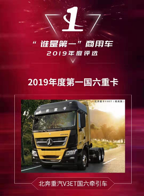 在此次2019“谁是第一”商用车年度评选结果中,“北奔新能源自卸车”与“北奔国六牵引车”分别斩获“2019年度第一新能源重卡”、“2019年度第一国六重卡”的称号。