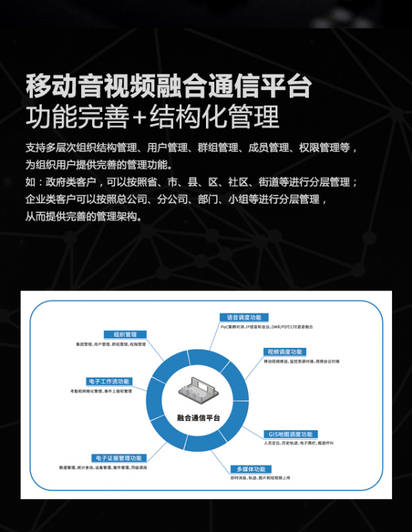 EV880音视频执法记录仪是一款可通过3G/4G、WIFI网络等不同无线管道,为用户提供集群语音、多媒体、可视化指挥调度等业务的执法记录终端。EV880在整体工业设计、功能配置、产品性能等各个方面均可圈可点,结合融合通信平台,可让用户从容实现一键拍照/图片回传、语音/视频对讲、指挥调度、业务管理等功能,为行业用户在多部门联动指挥、重大群体事件处置、自然灾害救援、大型安保等场景下提供坚实有效的业务支撑。