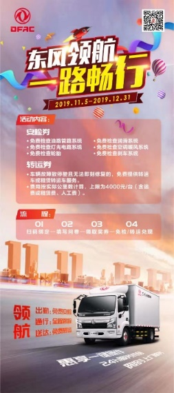 选一辆品质过硬又优惠实在的好车是基本,服务自然也不能落后。为赢战双十二物流高峰,东风轻型车还针对所有快递、物流客户制订“东风领航 一路畅行”真美满货运无忧专项服务方案,11月5日至12月31日,所有客户均可享“6大全车免检+2大转运服务支持”,即提供含车辆油路管路系统、空调暖风系统、刹车系统等6项全车免费检查,免费转运车或租赁转运车2项货运转运服务,助力广大卡友高效出勤全程无忧。