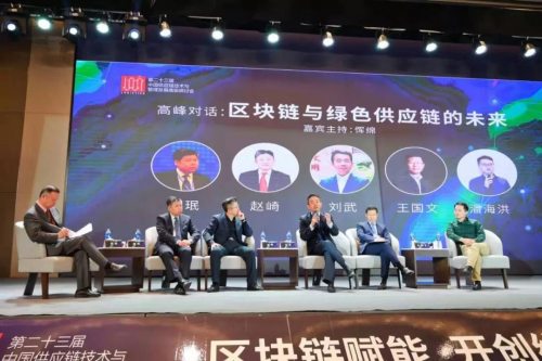 常务理事恽绵主持。中物联区块链分会执行秘书长潘海洪、宝供物流企业集团董事长刘武、中国(深圳)综合开发研究院物流与供应链管理研究所所长王国文、北京乐思门咨询总经理、中物联采购委专家组组长、中国物流协会常务理事胡珉、德国4flow咨询副总裁赵崎等重磅嘉宾围绕着“区块链与绿色供应链的未来”进行智慧碰撞。