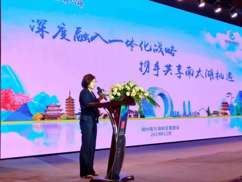 会长何黎明、湖州南太湖新区党工委副书记徐晓惠先后发表致辞: