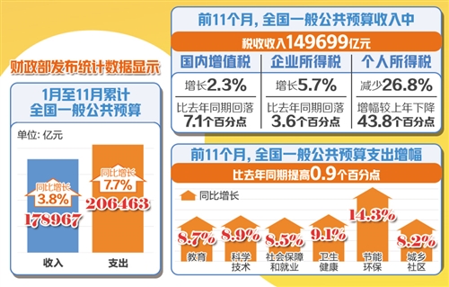 前11月全国一般公共预算收入178967亿元,同比增长3.8%——