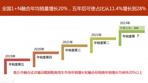 商丘融合试点克服多重不利因素,在没有任何激励政策的情况下,实现了北汽福田商用车商丘试点融合经销量比2018年河南同地区同口径同比销量增长超百分之三十五!完成了期望增长百分之二十的任务。为2020年“1十N”双渠道融合直销奠定了基础、积累了经验!