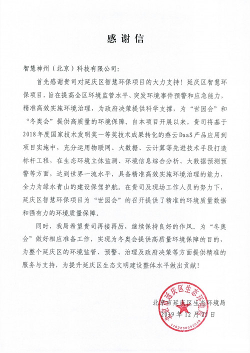 就在近日,神州控股再次受到北京市延庆区生态环境局表彰与感谢。
