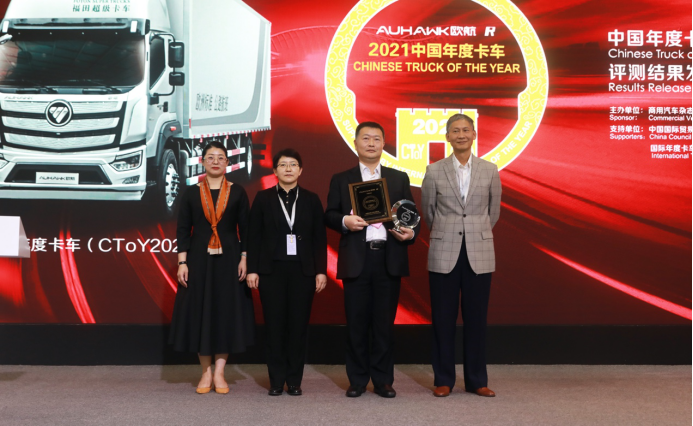 在颁奖现场,特邀嘉宾、中国汽车工业协会专务副秘书长姚杰先生,中国年度卡车颁奖活动支持方代表、中国国际贸易促进委员会汽车分会副会长杨琳女士,中国年度卡车颁奖活动主办方代表、北京卓众出版有限公司副总经理、商用汽车杂志社社长于晶女士,向获奖品牌的制造企业代表——福田汽车集团副总裁、欧航欧马可事业部总裁顾德华先生,颁发了“2021中国年度卡车”的奖杯和奖牌。