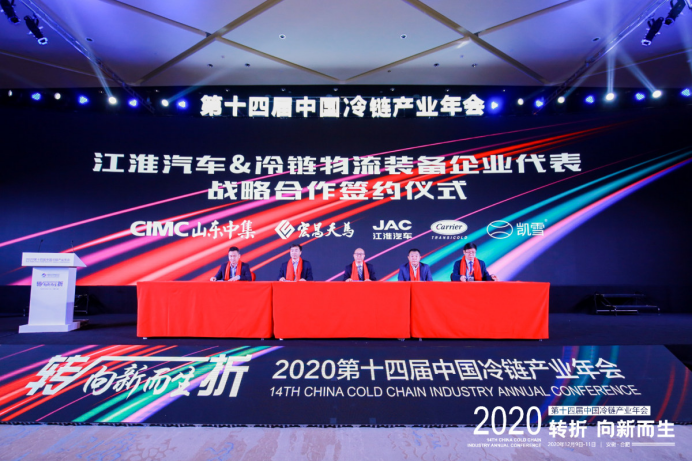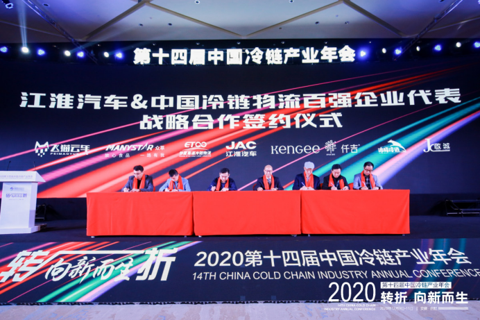 年会上,江淮汽车作为行业领先的冷藏车生产企业,与飞猫云年、上海众萃物流、华夏易通冷链、仟吉食品、冰峰冷链物流、上海敬诚物流、山东中集、宏昌天马、开利中国、凯雪冷链签署战略合作协议,共同打造更加符合中国冷链物流企业需求,满足行业发展标准的冷藏车辆。