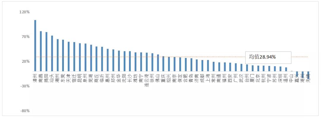 业务量前五十位城市年货节前期同比增幅情况