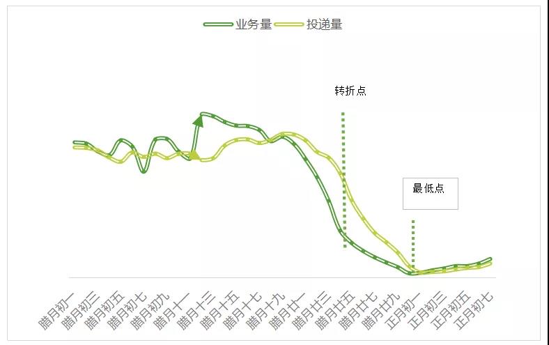 结合往年数据,腊月二十四前后快递量、投递量出现转折点,呈急剧下降的情况,在除夕、大年初一迎来最低点。今年受多种因素影响转折点或将延后,春节前后最低点预计仍出现在除夕及大年初一,但整体仍呈均衡趋势,收寄时效将略受影响或将低于当前水平。