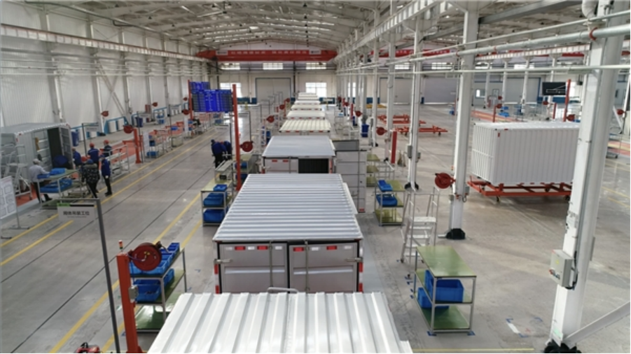 总装车间建有瓦楞厢分装线、仓栅厢分装线、瓦楞厢合厢线、冷藏厢无动力线。车间内冷藏厢生产线采用无动力推动,可满足肉挂厢、微卡厢以及普通冷藏厢等一系列产品的生产工艺,实现多品种、多吨位产品的柔性化混线生产。