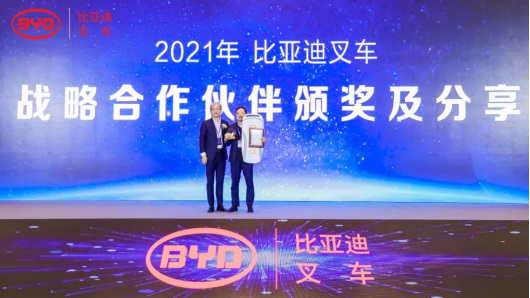 在近两年全球并不明朗的经济形势下,比亚迪叉车依旧保持销售业绩稳步增长,除自身力求进取、不断开拓之外,更是众多经销商共同努力的成果。本次大会上比亚迪叉车特授予广州佛朗斯股份有限公司战略合作伙伴奖。