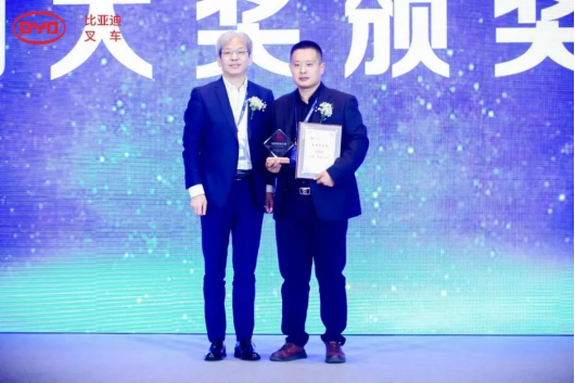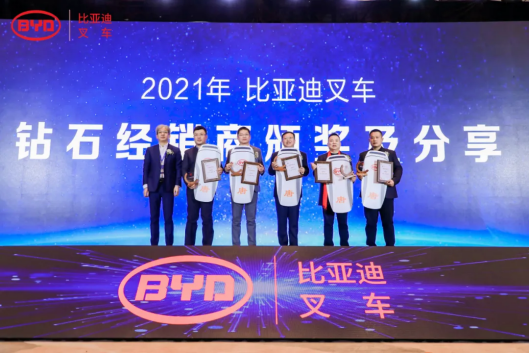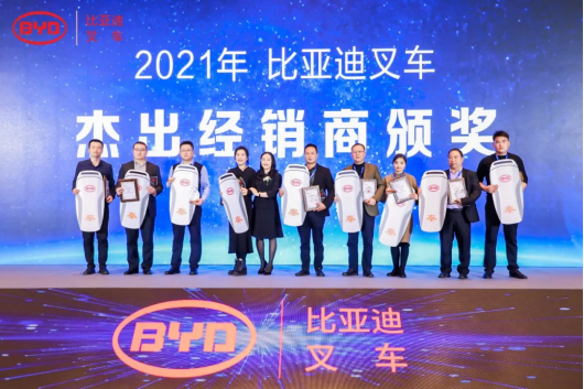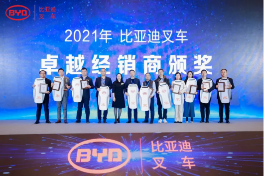 大会同时颁发了创新营销大奖、F系列推广大奖、卓越经销商奖、杰出经销商奖项,也对在2021年销售业绩较为突出的优秀经销商进行了奖励,以感谢他们对比亚迪叉车发展做出的贡献。