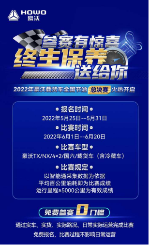 本次大赛更有重磅大奖:比赛成绩前五名的客户,可享受整车终生免费保养(仅限现任车主,车辆买卖后不再享受);前十名客户可获得2000元购车抵用券、精美车模、“豪沃节油英雄”荣誉证书等奖励;而且,只要参与线上报名的客户,即可到豪沃4S店免费领取尿素一桶,推荐其他客户购车成功更享额外豪礼;此外,凡报名成功的卡友,均有机会获赠豪沃精美车模一辆。