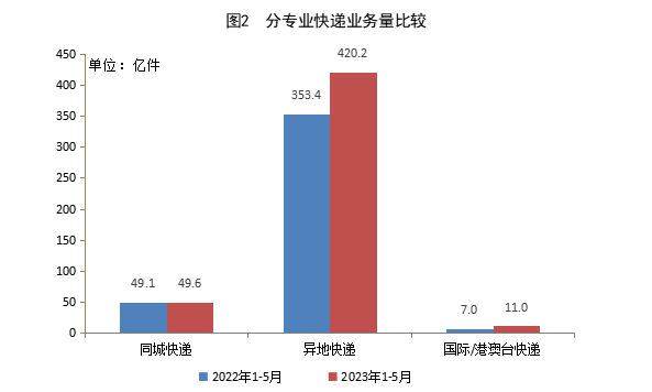 1-5月,同城快递业务量累计完成49.6亿件,同比增长1.2%;异地快递业务量累计完成420.2亿件,同比增长18.9%;国际/港澳台快递业务量累计完成11.0亿件,同比增长56.9%。