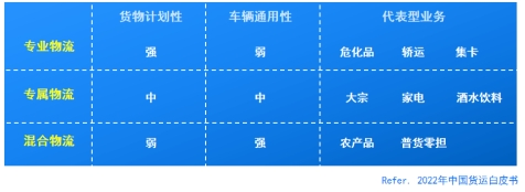 运力组织的垂直化。按经营的计划性和对车辆的通用性要求,可以分为专业物流、专属物流、混合物流。如上图所示,在不同细分领域里,因为业务的差异性和车辆运输的差异性,不太可能由一个平台去完成所有行业、所有场景的交易和运输。因此我们可以推测,未来细分领域运力池的积累、认知和连接能力是运力组织的核心竞争力。积累就是触达的运力量级,在同一个细分领域能够触达的量级足够大,那么就构成了这个运力组织的护城河。认知就是对运力池里所有车辆的理解,这些车各自擅长跑哪些路线和货物类型,司机有无违约行为,能耗方面处理的怎么样等等。认知越充分,运力组织未来赋能给企业/货主的时候越有竞争力。连接就是上游跟多少家货主进行连接,下游跟多少家车队和个体车主进行连接,连接数越高这个运力组织的价值就越大。