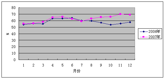 从购进价格指数来看,该指数自去年11月份以来,一直保持在55%以上,特别是2007年3月份以来,呈明显的上升趋势,4、5月份达到65%左右,6、7两月略有回落,8月份以后再现持续攀升,不断创下最高记录。2007年1-12月该指数平均值为63%,高出去年同期平均值4.8个百分点,最低值也达到55.4%,高出去年同期最低值大约2个百分点。分行业来看,购进价格指数较高、上升较快的行业主要分为三类: