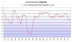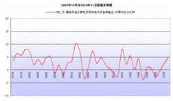 11月份,通信设备计算机及其他电子设备制造业内需与出口比例指数为4.6,比上月上升2.2个百分点,与去年同期相比上升7.1个百分点;利润趋势指数为-2.6,比上月下降3.0个百分点,与去年同期相比下降7.8个百分点。