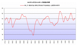11月份,通信设备计算机及其他电子设备制造业主要原材料库存指数为50.5,比上月上升1.7个百分点,与去年同期相比上升4.2个百分点;产成品库存指数为49.3,比上月上升8.1个百分点,与去年同期相比上升5.4个百分点。