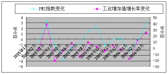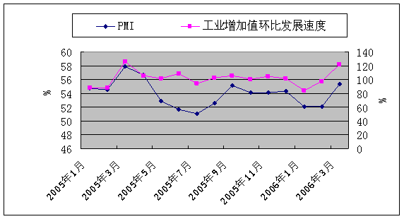 图4.4 2005年1月-2006年3月PMI指数与工业增加值环比发展速度比较