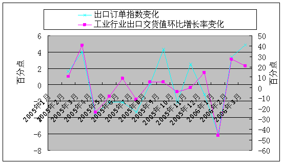 图4.8 出口订单指数变化与工业行业出口交货值环比增长率变化比较
