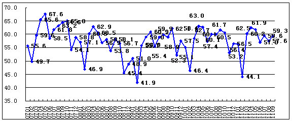 中间投入价格指数小幅回调。2011年9月中间投入价格指数为59.9%,环比回落0.3个百分点。分行业来看,建筑业和消费性服务业相同,均为61.0%;生产性服务业最低,为57.6%。20个行业中,餐饮业、建筑装饰业、住宿业、零售业和建筑安装业等行业高于60%;房地产业、航空运输业、电信及其他信息传输服务业和邮政业等行业在50%-60%之间。