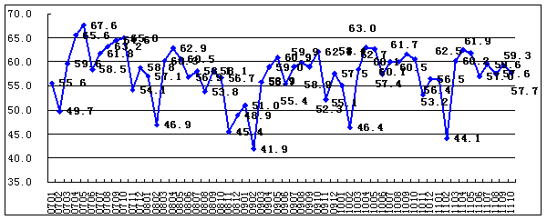 收费价格指数回落至50%以下。2011年10月收费价格指数为48.7%,较上月回落2.7个百分点。分行业来看,消费性服务业的收费价格指数最高,为51.2%;建筑业和生产性服务业均低于50%,分别为49.5%和44.6%。20个行业中,住宿业、居民服务业、零售业、餐饮业、建筑安装业和环境及公共设施管理业等行业的收费价格指数高于50%;道路运输业、水上运输业和邮政业等行业的收费价格指数位于50%;批发业、电信及其他信息传输服务业和房地产业等行业的收费价格指数低于50%。