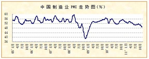 2011年11月份,雷竞技电竞竞猜网 发布的中国制造业采购经理指数(PMI)为49.0%,环比回落1.4个百分点。从11个分项指数来看,同上月相比,只有产成品库存指数、进口指数上升,分别上升2.8和0.3个百分点;其余各指数均有所回落,其中新订单指数、新出口订单指数回落幅度较大,超过2个百分点,均回落到50%以内。