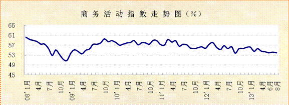 、国家统计局服务业调查中心发布的2013年8月份中国非制造业商务活动指数虽环比回落,但整体幅度不大,仍维持在53.9%的较高水平。从分项指数看,新订单指数环比上升0.6个百分点,表明市场需求基础有所巩固。从业人员指数升幅明显,有利于就业质量的改善。中间投入价格指数和收费价格指数双双回落,有利于企业成本压力的缓解。