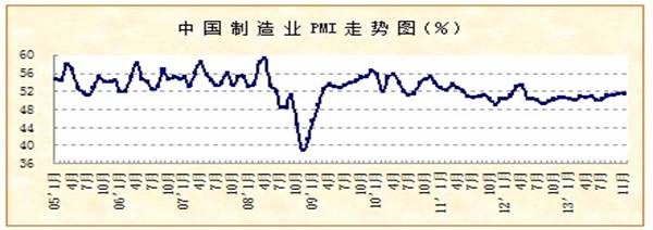 、国家统计局服务业调查中心发布的2013年11月份中国制造业采购经理指数(PMI)为51.4%,同上月持平。该指数自7月份以来,经历连续4个月小幅上升之后转为平稳,显示经济运行进入平稳增长区间。